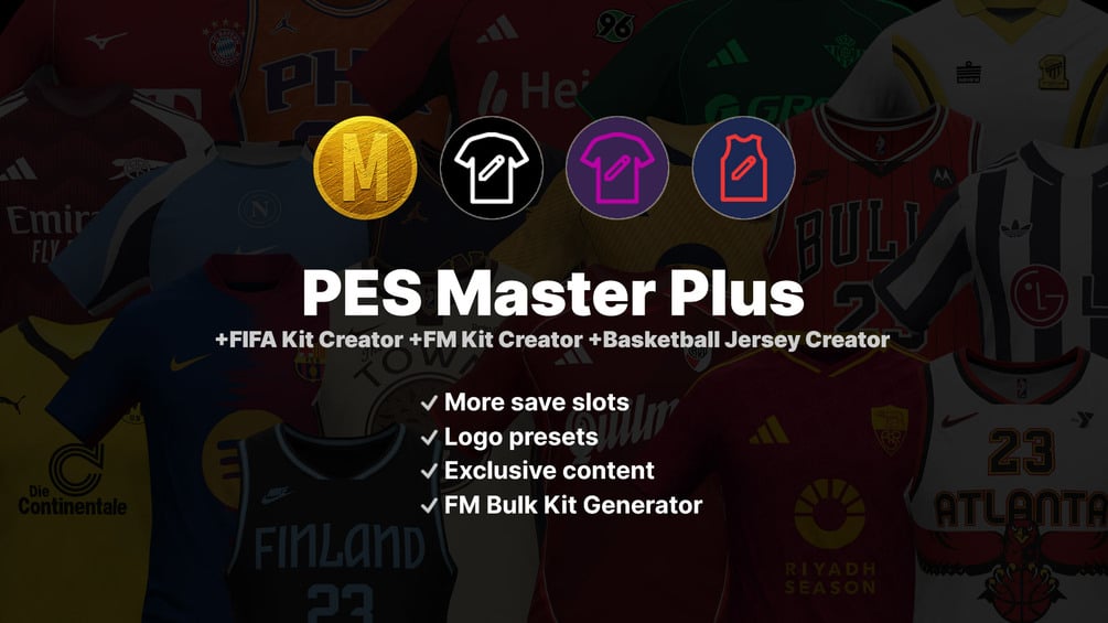 Compatible with PES Master Kit Creator, FIFA Kit Creator, FM Kit Creator and Basketball Jersey Creator.